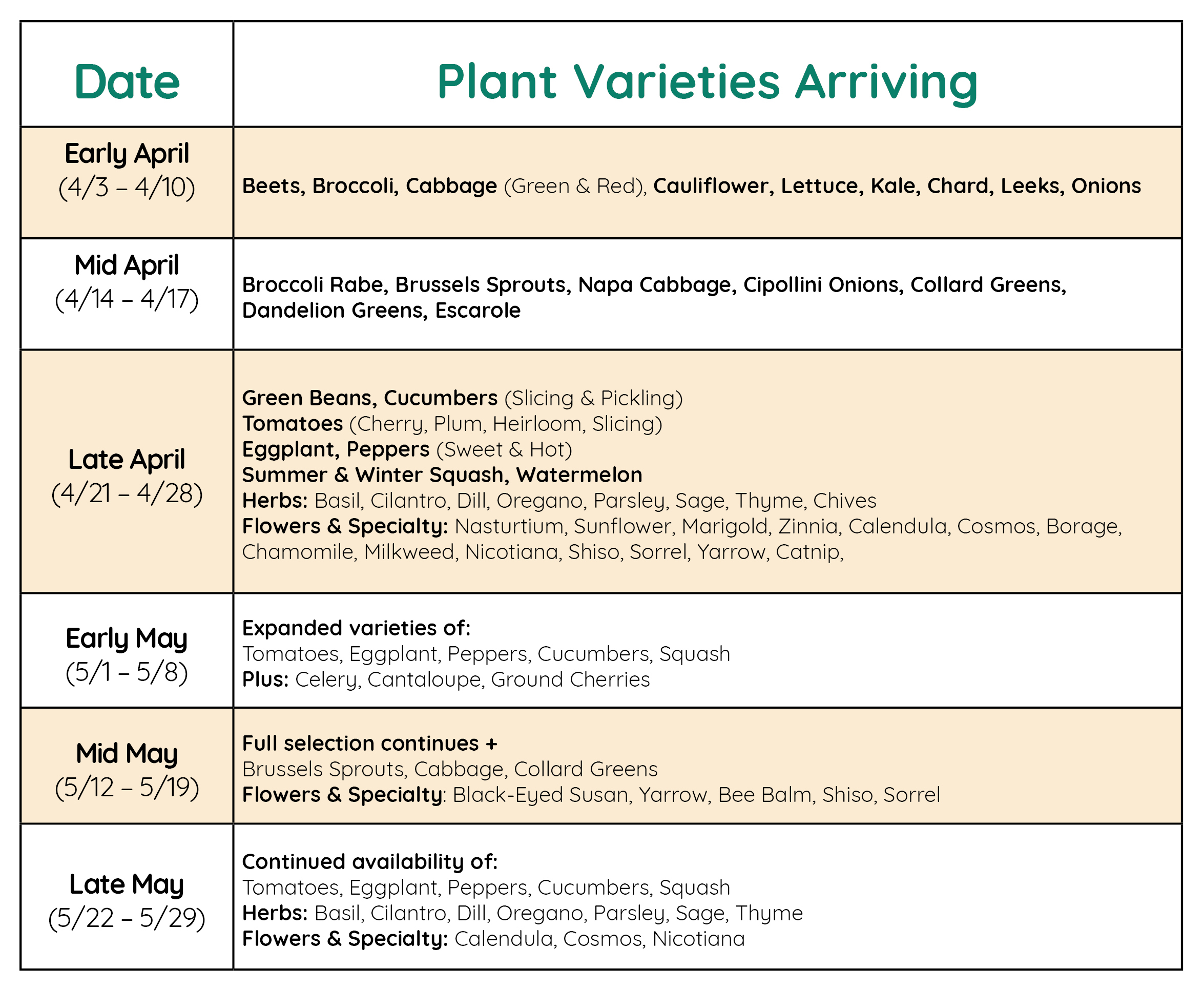 This comprehensive guide provides details about growing over 100 different varieties of fruits, vegetables, herbs and flowers. While we may not always have every variety listed in this guide, our staff of experts can help you pick out substitutes that will work well for your special garden. Also, be on the lookout for unique and unexpected varieties to pop up throughout the year, like Angelica, Aztec, or Blue Vervain. Happy gardening!